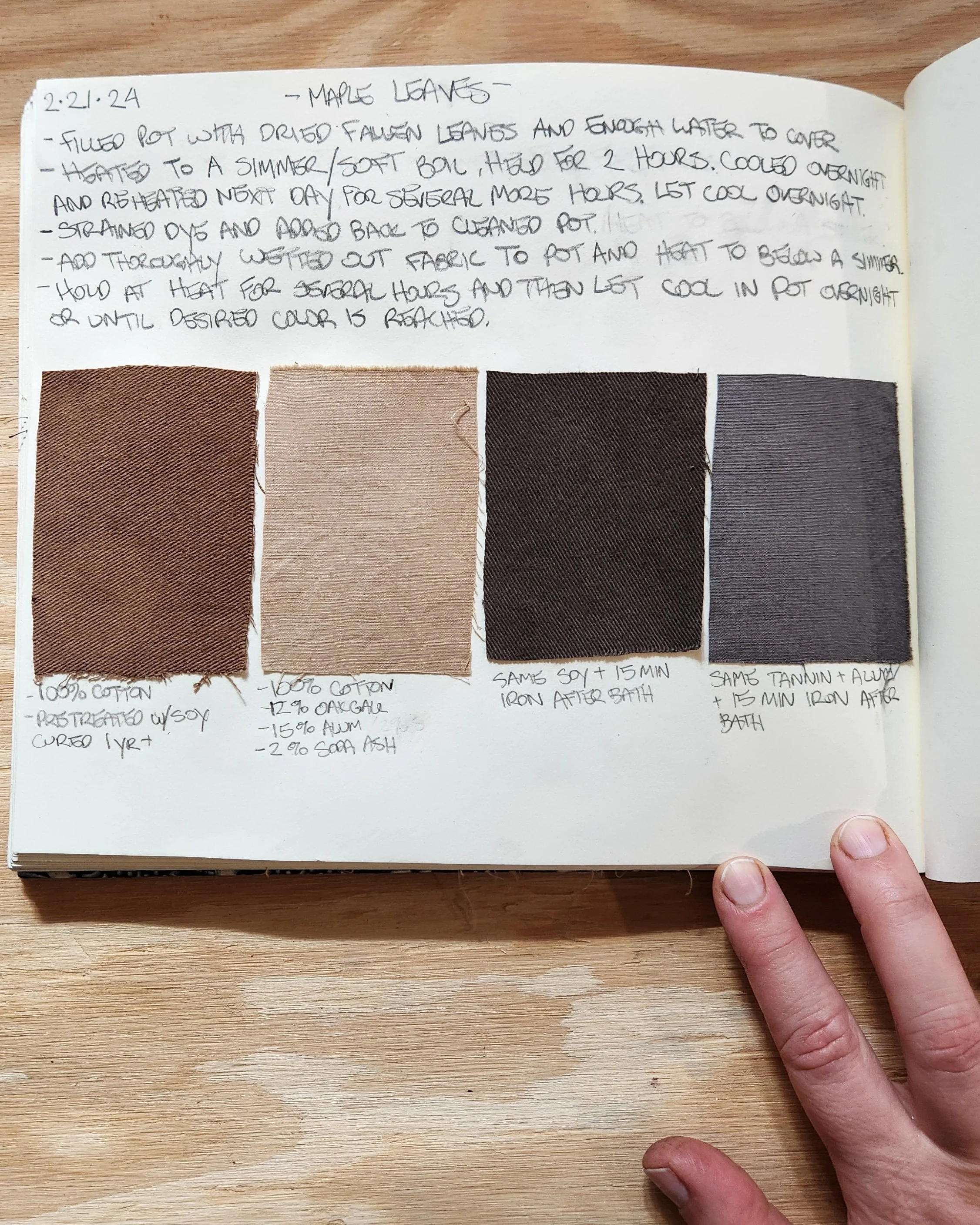 I began this journal many years ago as a grad student taking my first natural dye course. I handmade the book with covers wrapped in indigo-dyed Dutch cloth from my collection of vintage textiles, and finished it with brick-pattern endpapers that I letterpress printed. As my natural dye practice grew more intentional in early 2021, I found myself returning to this journal. It has become the place where I record process notes each time I work with a new plant dye or technique. I see my dye journal as an essential tool in my practice, but also an art form in its own right.